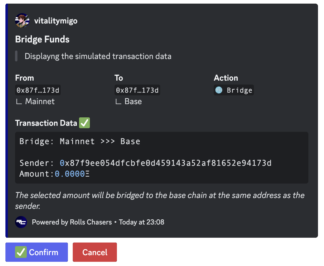 Once you've confirmed the inputs, the bot will simulate the transaction and send you back the various information about the bridge. You can check the sending address, the bridge direction, as well as the ether value your are bridging. This gives you a complete visibility over the execution of the transaction and the transfer of your funds.&#x20;
