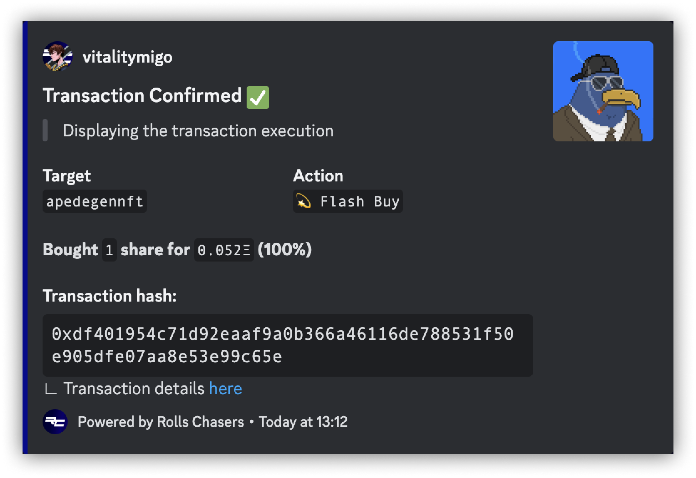 Once the transaction is confirmed, the bot will return the its information such as the share bought, the amount (always one), the value paid including gas fees and the transaction hash.
