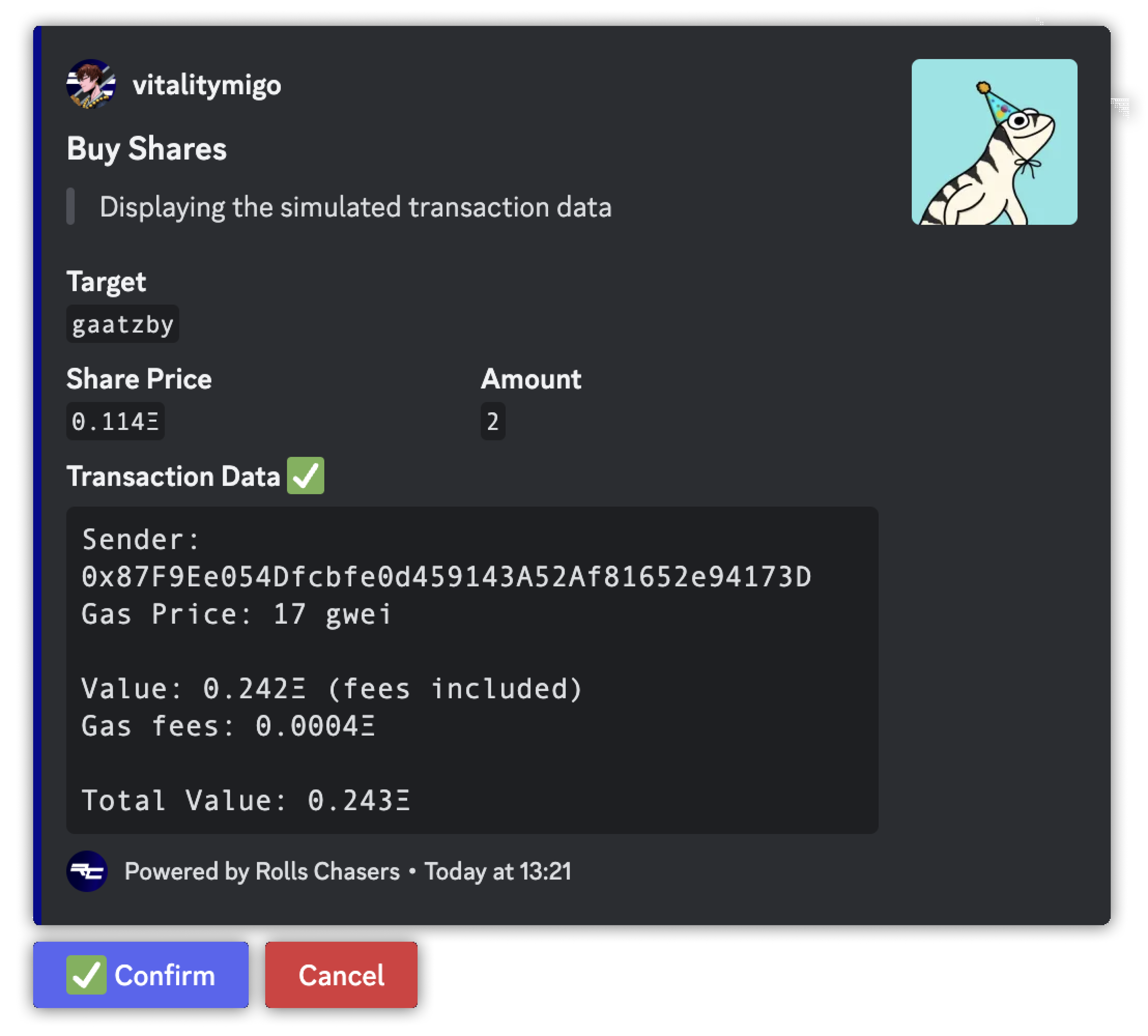 If you're satisfied with the simulation, click on the Confirm button <img src="https://1616862119-files.gitbook.io/~/files/v0/b/gitbook-x-prod.appspot.com/o/spaces%2FJVrXrwbzdXe3320u9fD1%2Fuploads%2FNjTmlrphSpkN8LbqGhW5%2FScreenshot%202024-01-07%20at%2010.26.45.png?alt=media&#x26;token=55d92006-1755-4090-901e-299307935d9d" alt="" data-size="line">. Once confirmed, the bot will return the executed transaction information such as the share bought, the amount, the value paid including gas fees and the transaction hash.